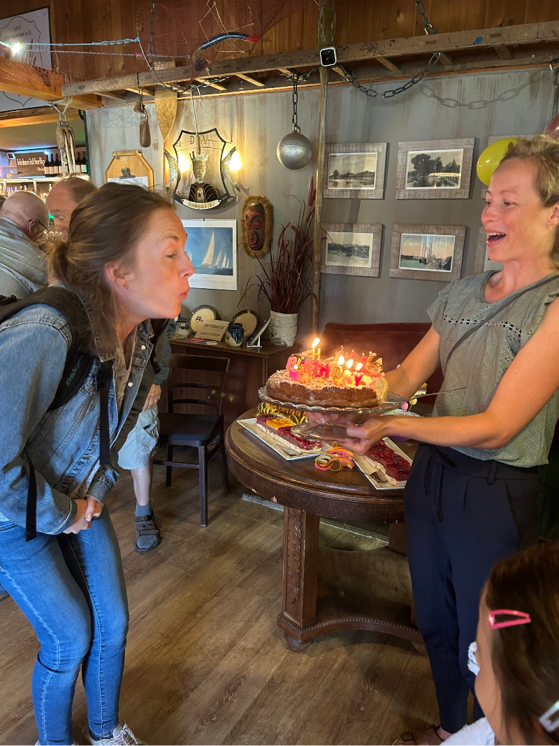16.8.2025 ~~~ Heute sind wir in Ribnitz-Damgarten. Am Nachmittag soll die überraschungsfeier für Madeleine stattfinden, ihre besten Freundinnen sind schon in der kleinen Gaststätte am Hafen und wir helfen noch ein wenig bei den Vorbereitungen: Tische schmücken, Luftballons aufhängen, den Kuchen mit Kerzen schmücken. Ein große luftgefüllten 40 hängt an der niedrigen Decke. Emanuel informiert mit kurzen Nachrichten übers Handy die versammelte Gästeschar, wie viele Minuten es noch dauern wird, bis sie eintreffen. Madeleine wurde glaubhaft vermittelt, sie geht mit ihrer Familien zum Kaffeetrinken...